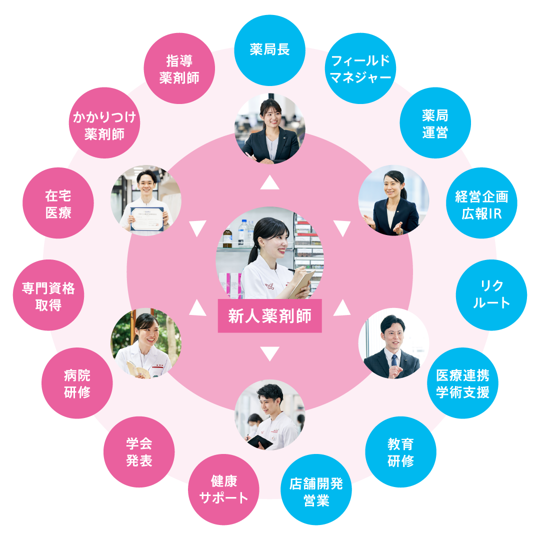 「なりたい薬剤師像」や「働きたいステージ」を実現するために、アイングループでは、キャリアの選択肢と一人ひとりに寄り添う研修が一体となり、あなたの成長を加速させる仕組みが整っています。