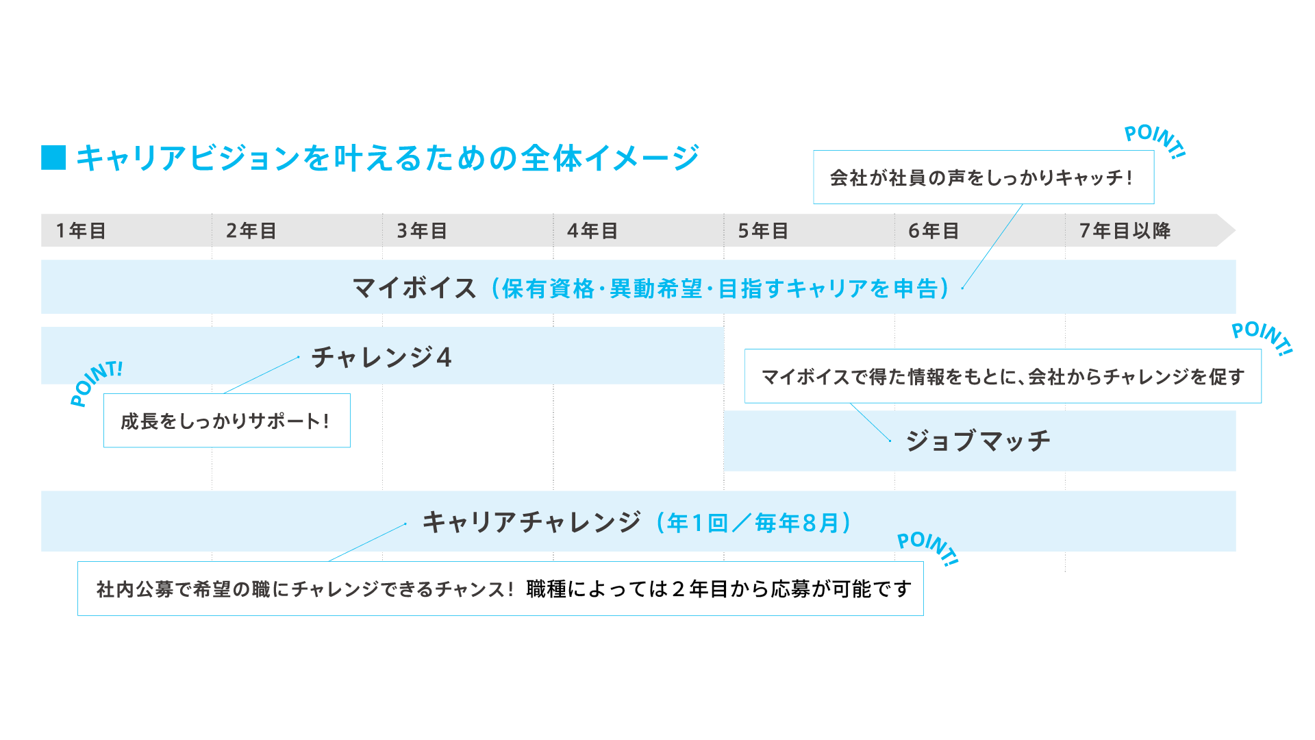 入社からの4年間を”もっとも成長できる期間”と捉え、その成長をサポートする「チャレンジ4」。スキルや経験、働き方について想いを伝える「マイボイス」。その想いをもとに会社から新しい役割を提案する「ジョブマッチ」。そして、自ら手を挙げて新しいフィールドに挑戦できる社内公募制度「キャリアチャレンジ」。