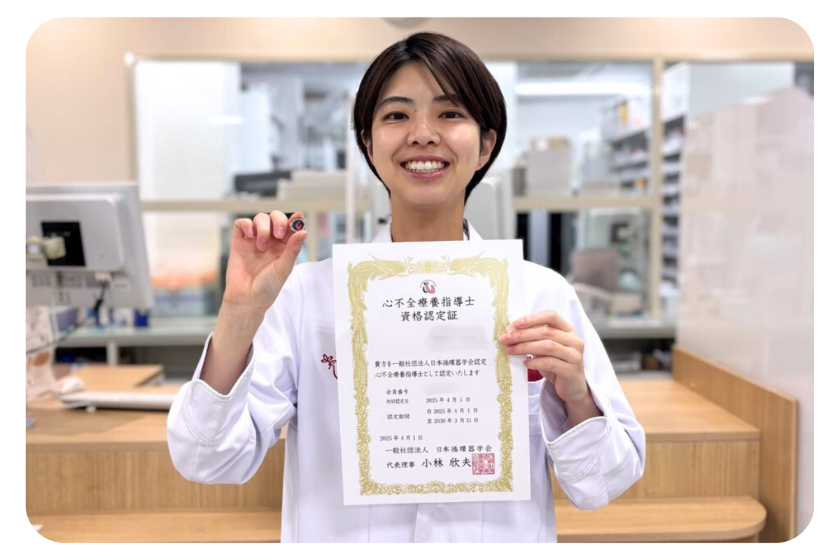 また、今後はこの役割を自分ひとりではなく、周りにも広げていきたいですね。循環器疾患に苦手意識を持つ薬剤師も少なくありませんが、「当たり前に生活を支えること」だと伝え、仲間の輪を広げていきたいです。実際に今、店舗の後輩が資格取得を目指しており、そのサポートもしています。 将来的には病院薬剤師や多職種とも連携し、地域全体でケアの質を高めていけるような存在を目指します。